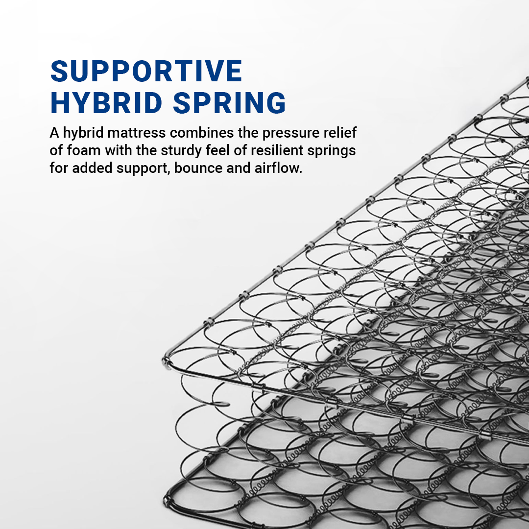 A hybrid mattress combines the pressure relief of foam with the sturdy feel of resilient springs for added support, bounce and airflow.