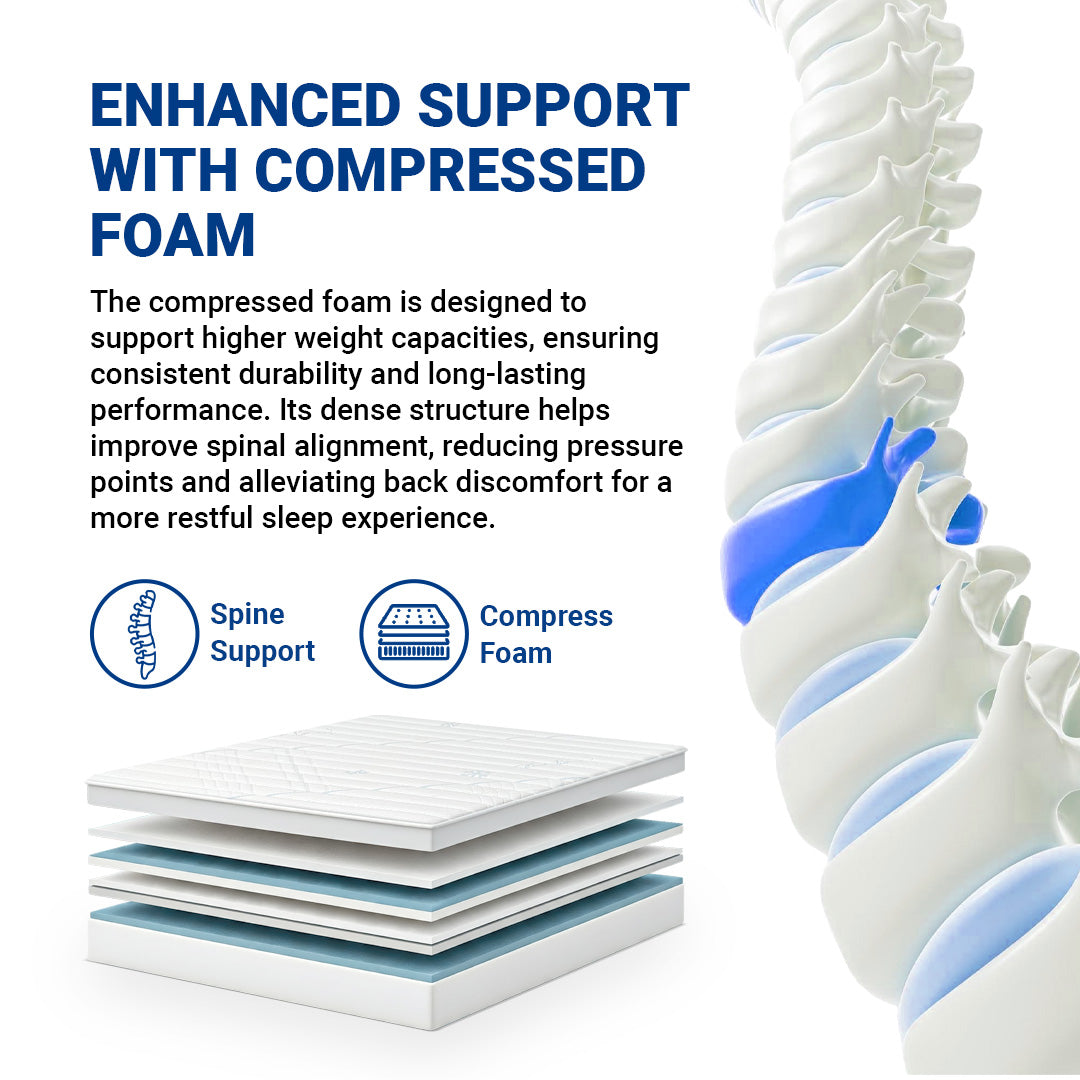 Premium Compress Foam: The advanced compress foam core is engineered to support higher body weights, offering unparalleled comfort and stability. This premium foam is designed to relieve pressure points and improve spinal alignment, helping to alleviate back and joint pain for a better, healthier sleep.